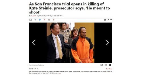 As San Francisco trial opens in killing of Kate Steinle, prosecutor says, ‘He meant to shoot’, SFgate.com, October 23, 2017The San Francisco murder case that ignited a national debate over immigration policy went to trial Monday with attorneys sparring not over politics but the case’s central legal question — whether the killer of Kate Steinle on Pier 14 intended to fire in her direction or accidentally shot a gun he said he found under a bench.
