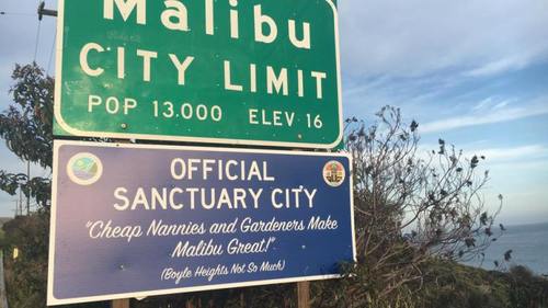 MALIBU (CBSLA) — A sign posted along the Pacific Coast Highway in Malibu was drawing a great deal of attention and controversy Tuesday.[Comment at Unz.com]It reads: “OFFICIAL SANCTUARY CITY ‘Cheap Nannies and Gardeners Make Malibu Great!’ (Boyle Heights Not So Much)” …
