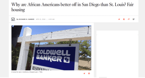 Why are African Americans better off in San Diego than St. Louis? Fair housingThis might also have something to do with the median home price in San Diego being $618,000 versus $128,000 in St. Louis. Not surprisingly, St. Louis is 49.2% black while San Diego is 6.7% black.By RICHARD H. SANDER