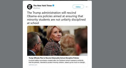 Dec. 17, 2018WASHINGTON — The Trump administration is planning to roll back Obama-era policies aimed at ensuring that minority children are not unfairly disciplined, arguing that the efforts have eased up on punishment and contributed to rising violence in the nation’s schools, according to documents obtained by The New York Times.