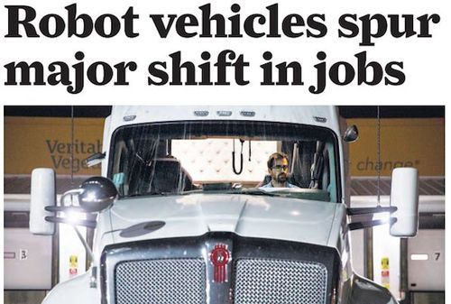 Robot cars may kill jobs, but will they create them too?, San Francisco Chronicle, December 10, 2017Naturally there is the usual chirping about safety — “far fewer traffic accidents” — as is the case above, but the mega-profits for future winners are mentioned further down in the article:Millions of people drive for a living; autonomous technology could make their work obsolete