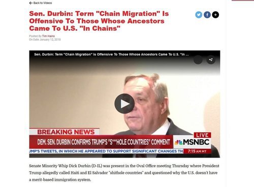 … Durbin continued: “When it came to the issue of, quote, ‘chain migration,’ I said to the president, do you realize how painful that term is to so many people? African-Americans believe they migrated to America in chains and when you talk about chain migration, it hurts them personally. [Trump] said, ‘Oh, that’s a good line.’”