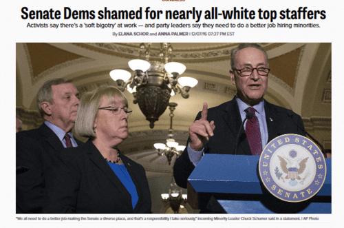 So far, Trump’s team has not announced any similar plans to prioritize diversity as they fill thousands of appointed positions in the executive branch.That’s because staffers are important to Senate Democrats so they can’t mess around with a lot of diversity nonsense. They might wind up hiring incompetents.“The problem is quite pronounced, and frankly, people need to be called out for it,” another ex-Senate Democratic staffer said, calling it “embarrassing” that only two Latinas, and one African-American, hold senior staff positions. In fact, no statistics are completely up-to-date because offices are not required to report on staff diversity.