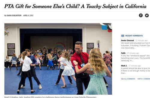 PTA Gift for Someone Else’s Child? A Touchy Subject in California By DANA GOLDSTEIN APRIL 8, 2017I’m not sure that the term “more solidly affluent” quite captures the level of wealth in either Malibu or Santa Monica.SANTA MONICA, Calif. — Of all the inequalities between rich and poor public schools, one of the more glaring divides is PTA fund-raising, which in schools with well-heeled parents can generate hundreds of thousands of dollars a year or more.
