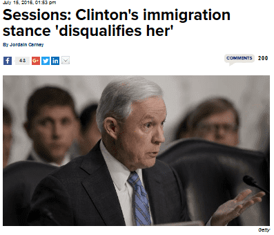 [Sessions: Clinton's immigration stance 'disqualifies her, by Jordain Carney, The Hill, July 15, 2016]