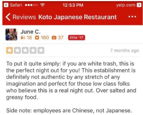 “To put it quite simply: if you are white trash, this is the perfect night out for you!” she wrote in one review of a Japanese restaurant.