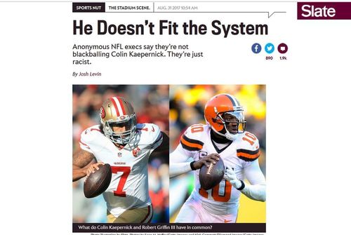 Here’s the subhead: “Anonymous NFL execs say they’re not blackballing Colin Kaepernick. They’re just racist.”