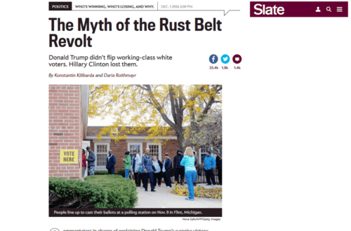 The Myth of the Rust Belt RevoltI haven’t looked at the math to see if this characterization stands up, but I’ve been talking for years of the utility of a half-a-loaf strategy. The Trump campaign spent a fair amount trying to lessen the enthusiasm for voting for Hillary of people were tough to persuade to go all the way to voting for Trump: maybe you can’t persuade Leon Jackson, a black Milwaukee high school gym teacher and veteran, to vote for Trump, but perhaps you can target him with ads on Facebook that sap his enthusiasm for voting for Hillary.Donald Trump didn’t flip working-class white voters. Hillary Clinton lost them.