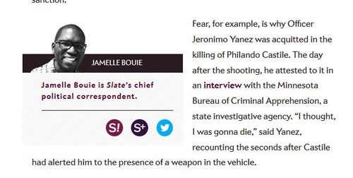 The Cloak of “Fear”Emphasis mine.Police officers like the killer of Philando Castile have an unbeatable defense when their victims are black: They were scared.