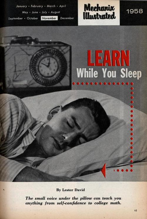 Sleep Learning or Hypnopaedia was a regular feature of 20th Century sci-fi books, such as Brave New World and many Heinlein stories. In the Future, you wouldn’t have to study, you’d just listen to lectures while you slept.