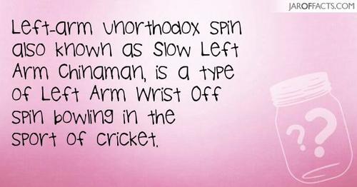 The bowler uses a wrist torsion action to spin the ball so that when it pitches it turns from off to leg for a right-handed batsman, i.e. from left to right from the bowler's perspective. The direction of turn mirrors that of a conventional right-handed off spin bowler, however, the ball will usually turn more sharply due to the spin being Chinaman_smallimparted predominantly by the wrist. Charlie 'Buck' Llewellyn, a South African all-rounder who played at the end of the 19th century, laid claim to inventing the delivery. Some chinaman bowlers occasionally bowl the mirror image of a leg-spinner's "googly" (or "wrong'un" in Australia), which turns in the opposite way in order to trick the batsman. In this instance the ball turns away from the batsman, as if the bowler were an orthodox left-arm spinner.  [What is chinaman style bowling in cricket? from Yahoo Answers.]