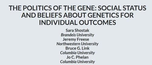 Social scientists have predicted that individuals who occupy socially privileged positions or who have conservative political orientations are most likely to endorse the idea that genes are the root cause of differences among individuals. Drawing on a nationally representative sample of the US population, this study examines belief in the importance of genes for understanding individual differences in a series of broad domains: physical illness, serious mental illness, intelligence, personality, and success in life. We also assess whether the belief that genetics are important for these outcomes is more common among those in relatively advantaged positions or among those who are more politically conservative. … Contrary to expectations, however, we find little evidence that it is more common for whites, the socioeconomically advantaged, or political conservatives to believe that genetics are important for health and social outcomes.