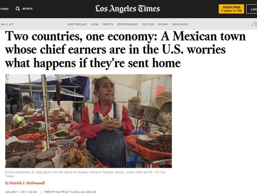 Two countries, one economy: A Mexican town whose chief earners are in the U.S. worries what happens if they’re sent home, Los Angeles Times, January 1, 2017From her stall featuring regional delicacies — chile-infused dried grasshoppers, juicy white worms from the maguey plant and handmade chocolates, among other edible fare — 63-year-old Eufenia Hernandez issued a challenge to U.S. President-elect Donald Trump.