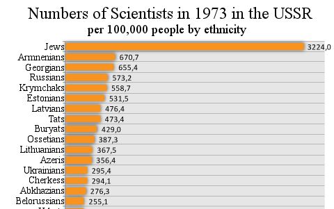 Not surprisingly, the #1 most scientific ethnicity in the Soviet Union were the Jews and the very last group were the Gypsies, with Gypsies producing about 1/500th as many professional scientists per capita as Jews.