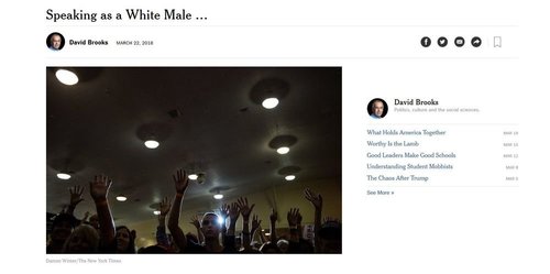 Speaking as a White Male …David’s background has nothing to do with his choice of Hannah Arendt and Irving Howe as examples …David Brooks MARCH 22, 2018