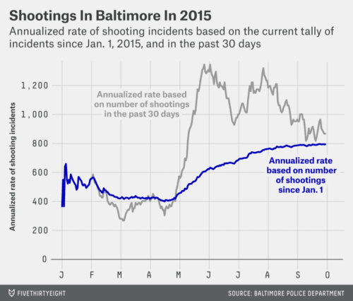 … Around 34 percent of nearly 3,000 shooting incidents in Baltimore since 2010 have ended in a fatality. Baltimore is on pace for a large jump in the number of murders this year, however, because the city is seeing 60 percent more shootings in 2015 than in 2014. While New Orleans appears to be experiencing a change in luck, Baltimore is experiencing a dramatic jump in gun violence.