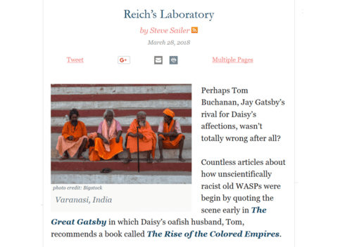 For poorly explained reasons, Reich feels it satisfying to occasionally vilify some of his own admirers, such as Watson, New York Times genetics reporter Nicholas Wade, the late genetic anthropologist Henry Harpending, reporter Jason Hardy, physicist Gregory Cochran, and economic historian Gregory Clark. In the funniest line in the book, Reich exclaims:
