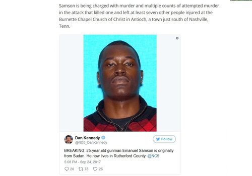 Tennessee Church Shooter Suspect Identified As 25-Year-Old From Sudan,Kudos to the Daily Caller for saying he was from Sudan—I notice that even so, they aren't using the word immigrant, let alone refugee. (Any Sudanese who finds himself in rural Tennessee as a child came here as part of the Refugee Resettlement Racket—this kind of thing a predictable consequence. )by Thomas Phippen, September 24, 2017