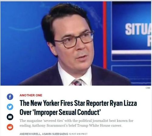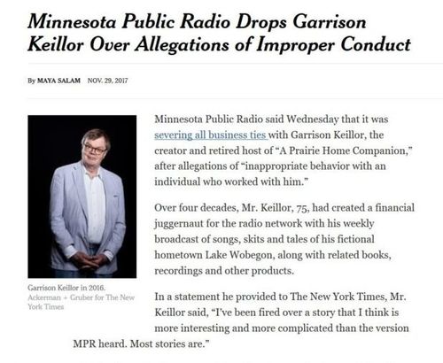 Poster boys here: Garrison Keillor of Prairie Home Companion fame and the spin-off show on National Public Radio, and Ryan Lizza of New Yorker magazine. Both were dropped with astonishing speed while sound vibrations from the voices of their unknown accusers were still traveling through the air.