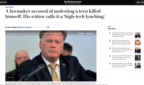 Well, Wednesday this week Kentucky State Representative Dan Johnson shot himself after a woman accused him of molesting her five years ago. I'm guessing we'll see more suicides before sanity is restored.