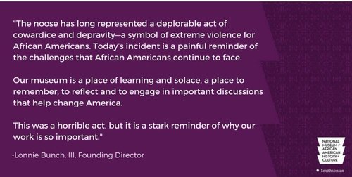 Lonnie Bunch III, founding director of the museum, said in a statement on Twitter, “The noose has long represented a deplorable act of cowardice and depravity—a symbol of extreme violence for African Americans. Today’s incident is a painful reminder of the challenges that African Americans continue to face.” … “This was a horrible act, but it is a stark reminder of why our work is so important.”