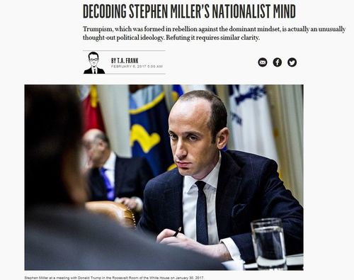 DECODING STEPHEN MILLER’S NATIONALIST MINDRead the whole thing there.Trumpism, which was formed in rebellion against the dominant mindset, is actually an unusually thought-out political ideology. Refuting it requires similar clarity.