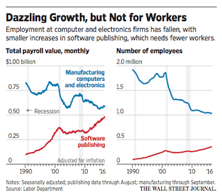 America’s Dazzling Tech Boom Has a Downside: Not Enough Jobs, By Jon Hilsenrath and Bob Davis, Wall Street Journal, October 13, 2016The discontent driving Donald Trump’s campaign stems partly from the dashed employment promises of the late 1990s; $7-an-hour robots