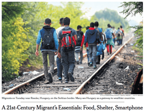 A 21st-Century Migrant’s Checklist: Water, Shelter, Smartphone, New York Times, August 24, 2015BELGRADE, Serbia — The tens of thousands of migrants who have flooded into the Balkans in recent weeks need food, water and shelter, just like the millions displaced by war the world over. But there is also one other thing they swear they cannot live without: a smartphone charging station.
