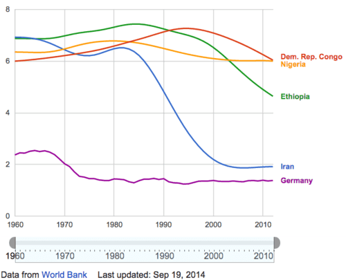 Above I’ve used Google to plot Total Fertility Rates (projected babies per woman per lifetime) for the three most populous countries in Africa. The TFR in Ethiopia has been falling, but is still well above 4. In Nigeria and Congo, its at six.