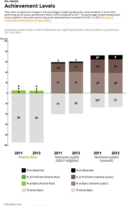 For example, among Puerto Rican 8th graders tested in mathematics in 2013, 95% scored Below Basic, 5% scored Basic, and (to the limits of rounding) 0% scored Proficient, and 0% scored Advanced. These results were the same in 2011.