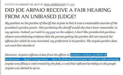 Subsequently, Mirengoff has presented the contents of an email he received from constitutional-law professor Ron Rotunda that gives many more details of Judge Snow's behavior in the initial case. They strike me as damning, but you should read them for yourself: Did Joe Arpaio Receive A Fair Hearing From An Unbiased Judge? [August 29, 2017]