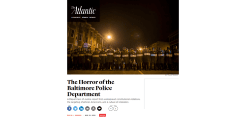 The Horror of the Baltimore Police DepartmentFrom the New York Times last January:A Department of Justice report finds widespread constitutional violations, discriminatory enforcement, and a culture of retaliation.
