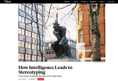 How Intelligence Leads to StereotypingOr by reading articles in The Atlantic reporting social science findings, as I’ve been doing since 1972.A new study complicates the trope of the stupid bigot.