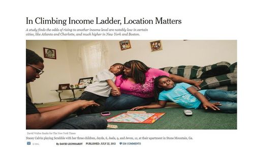 In Climbing Income Ladder, Location MattersThere was much cluck-clucking over how the poisonous legacy of Jim Crow and Nixon’s Southern Strategy was holding down both whites and blacks in the South to this day.A study finds the odds of rising to another income level are notably low in certain cities, like Atlanta and Charlotte, and much higher in New York and Boston.