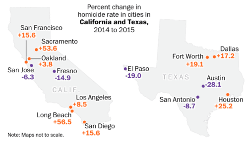 A general pattern was that increases in homicides, especially in absolute number terms, tended to be larger in cities with large black populations than in cities with large Hispanic populations. For example, the Post provided this graphic of California and Texas:
