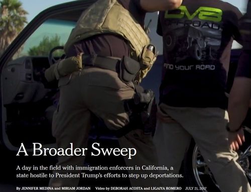 So when a team of immigration agents gathered at 4:30 on one already warm morning in June, their chief, David Marin, warned them to stay away from any sign of danger.Portrayed as a story of enforcement, the details of the story show something else—a story of wasted resources, non-enforcement, catch-and-release, and a miniature amnesty program for illegal aliens administered by Marin.[A Broader Sweep, By Jennifer Medina And Miriam Jordan, NYT, July 21, 2017]
