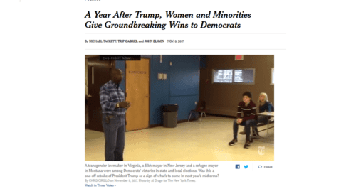 A Year After Trump, Diversity Has Its DayThe unstated problem with the Democrats’ Coalition of the Fringes strategy is that the only common denominator they’ve been able to think of to hold their fringes together is by stoking hatred of the cishet white man, such as in all the nationally publicized Hate Hoaxes.By MICHAEL TACKETT, TRIP GABRIEL and JOHN ELIGON 7:21 PM ET