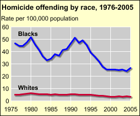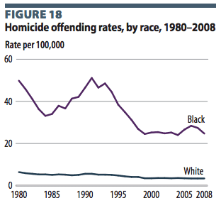 But the Obama Administration stopped maintaining that website (you can still find it here on Archive.org’s Wayback Machine). As of 2011 they made you look up the racial ratio in homicide offending rates in a less convenient PDF report. Here’s a screen capture of the homicide offending rates by race graph from that 2011 PDF: