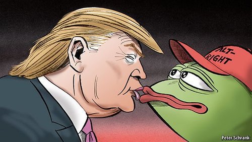 Much of the Alt-Right’s output will seem indecipherably weird to those unfamiliar with the darker penumbras of popular culture. It has its own iconography and vernacular, derived from message boards, video games and pornography. Its signature insult is “cuckservative”, directed at Republicans supposedly emasculated by liberalism and money. Its favourite avatar is Pepe the frog, a cartoon-strip creature co-opted into offensive scenarios; one Pepe image was reposted this week by Donald Trump junior and Roger Stone, a leading Trumpista, the latest example of the candidate’s supporters, and the man himself, circulating the Alt-Right’s memes and hoax statistics.