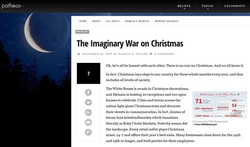 The Imaginary War on Christmas by Pamela K. Taylor, Patheos, December 22, 2017This is going past saying there's no War On Christmas to doing some more fighting against it. It's a typical to tactic present Kwanzaa, Hanukkah, etc as faux-Christmases, to quote Tom Piatak.