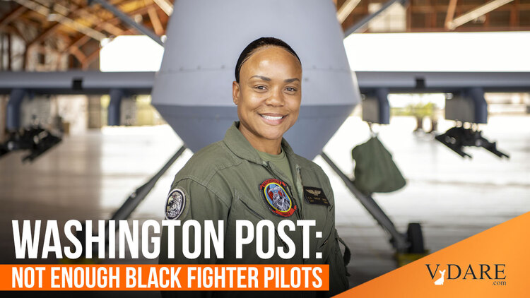 Here’s a highly splashed long article in the Washington Post news section investigating the burning problem that one of the three branches of the military that employ fighter pilots (the Army does not) is—and you’ll be shocked, shocked to learn this—in third place in terms of share of fighter pilots who are black: