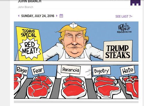 A graphic equivalent of Saletan’s verbiage is the cartoon by John Branch displayed at the top of this post. In his clever [not!] doodle, Branch suggests that Trump is peddling the “red meat” of rage, fear, paranoia, bigotry, and—wait for it!—hate. Would Branch be able to provide facts to substantiate any of these charges? Almost surely not; it’s all just received attitude, perhaps best termed “breathing while Left.”