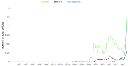 The New York Times has a tool called Chronicle for telling you what percentage of Times article have included a particular word over the centuries. Here we see “racism” in green, “sexism” in black, and “transgender” in blue, all shooting up post 2010: the Establishment having a nervous breakdown.