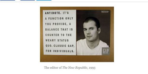 Within a few weeks, [Sullivan] will accept a longstanding offer to become a Gap model himself and pose in a magazine ad. It’s true: the editor of what is, arguably, America’s leading political journal lending the dignity of his position to a line of moderate-priced sportswear. …