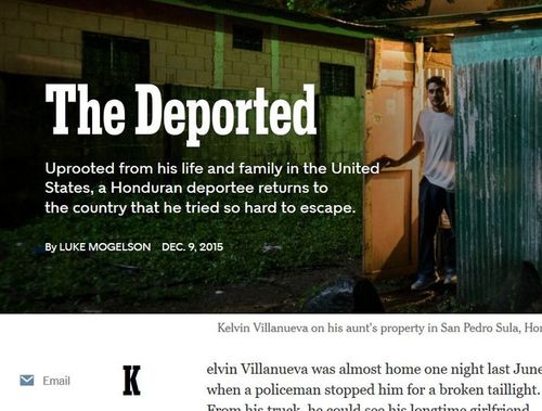 [The Deported: Uprooted from his life and family in the United States, a Honduran deportee returns to the country that he tried so hard to escape, by Luke Mogelson; New York Times, December 9th 2015.]