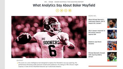 His score on a new intelligence test designed to replace the Wonderlic was eye-opening. His performance throwing under pressure raised some eyebrows. His rating on ‘NFL throws’ might surprise. A look at how Baker Mayfield measures up in advanced analyticsWhen I was young, Sports Illustrated would run literary essays about marlin fishing with gentleman adventurers, but now they just run nine-part series on the NFL draft prospects of Baker Mayfield, the Heisman Trophy winning quarterback from Oklahoma.By ROBERT KLEMKO March 22, 2018