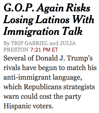 In Washington, Republicans keep taking steps that imperil their relationship with Hispanic voters, passing legislation to accelerate the deportation of Central American children at the southern border and comparing their influx to a warlike “invasion,” compounding an electoral disadvantage that many in the party are convinced cost them the White House in 2012.Here are a bunch more:But in a vivid display of the strife within the party over immigration, likely contenders for the 2016 Republican presidential nomination are charting their own, very different course: delivering pointed and personal overtures to the native countries from which millions of Hispanic Americans have immigrated.
