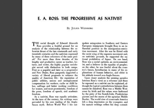John Derbyshire mentions in passing Edward Alsworth Ross (1866-1951), an old leftist professor of sociology who had a tumultuous public life that would be incomprehensible to today’s left. From Wikipedia: