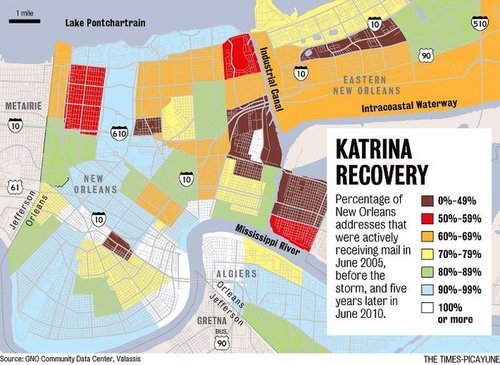 Racially Disparate Views of New Orleans’s Recovery After Hurricane Katrina By CAMPBELL ROBERTSON AUG. 24, 2015My impression of visiting New Orleans a couple of years after the hurricane is that it looked like a great place to have a trust fund. Not much of a city for earning a living, but a nice place to spend inherited wealth.NEW ORLEANS — As the 10th anniversary approaches of Hurricane Katrina and the catastrophic levee breaches in New Orleans, a new survey finds a stark racial divide in how residents here view the recovery.