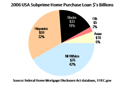 We still don't know the subprime default rates nationally by ethnicity, but the recent Boston Fed study found that the default rates on black and Hispanic subprime loans in Massachusetts were about twice the rate of white subprime borrowers. If that holds true for the whole country, then minorities appear to account for roughly two-thirds of defaulted subprime dollars.